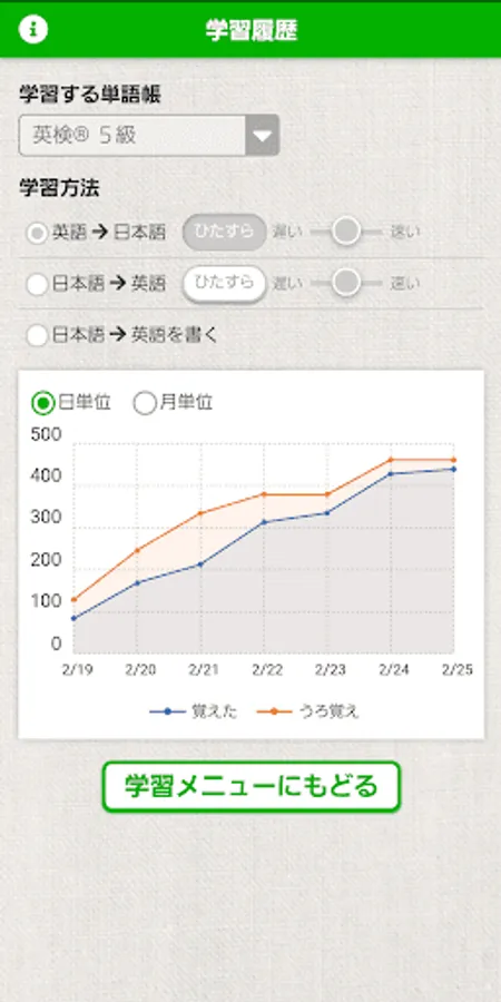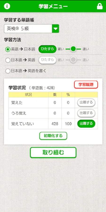 学習方法は「英語->日本語」「日本語->英語」「日本語->英語を書く」の3種類があります。