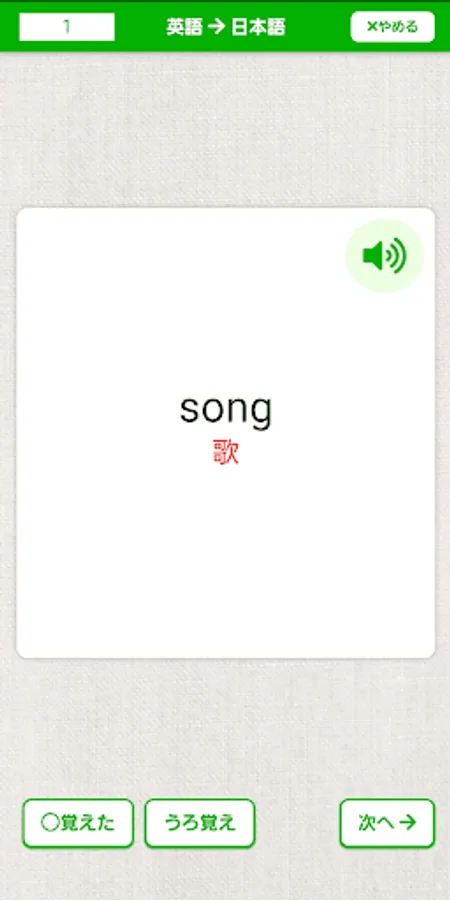 「英語->日本語」「日本語->英語」は、カードをめくって一単語ごとに暗記する学習方法です。カードのめくり方は、設定した時間間隔で自動的にカードがめくられる「ひたすら」モードにすることもできます。