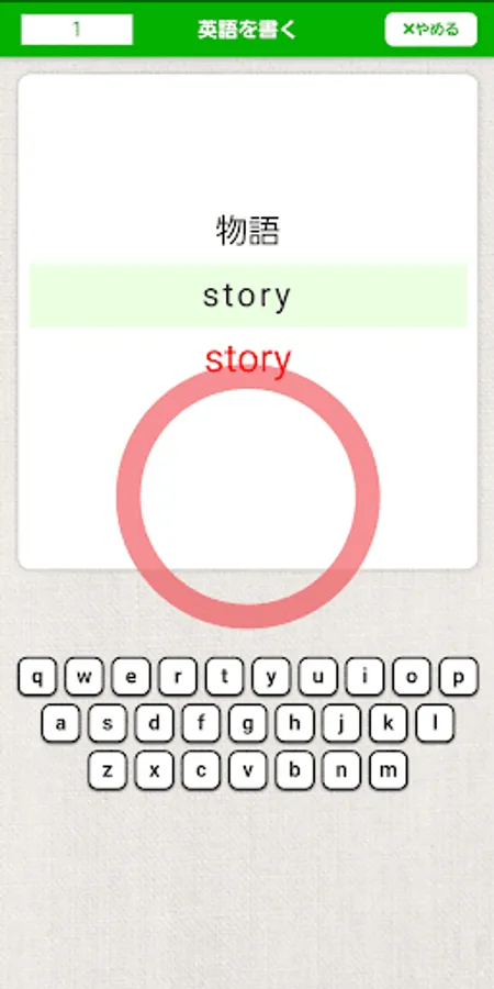 「日本語->英語を書く」は、英単語を一文字ずつキーボードで書いて覚えることができる学習方法です。