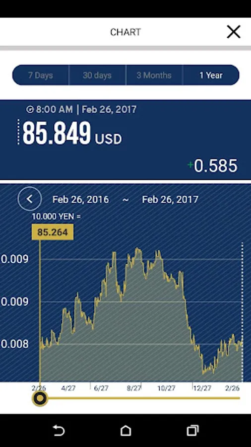 Exchange rate chart date ranges from Today's rate, 7 days ago, 30 days ago, 3 months ago up to 1 year ago. You can jump into any graph to compare the currency trends and find the best rate.