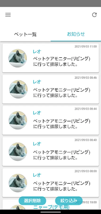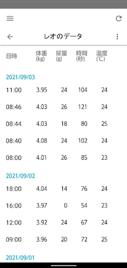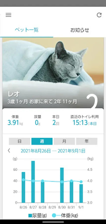 You can check health data such as the weight and urine volume of your cat measured with a pet care monitor with a simple graph.