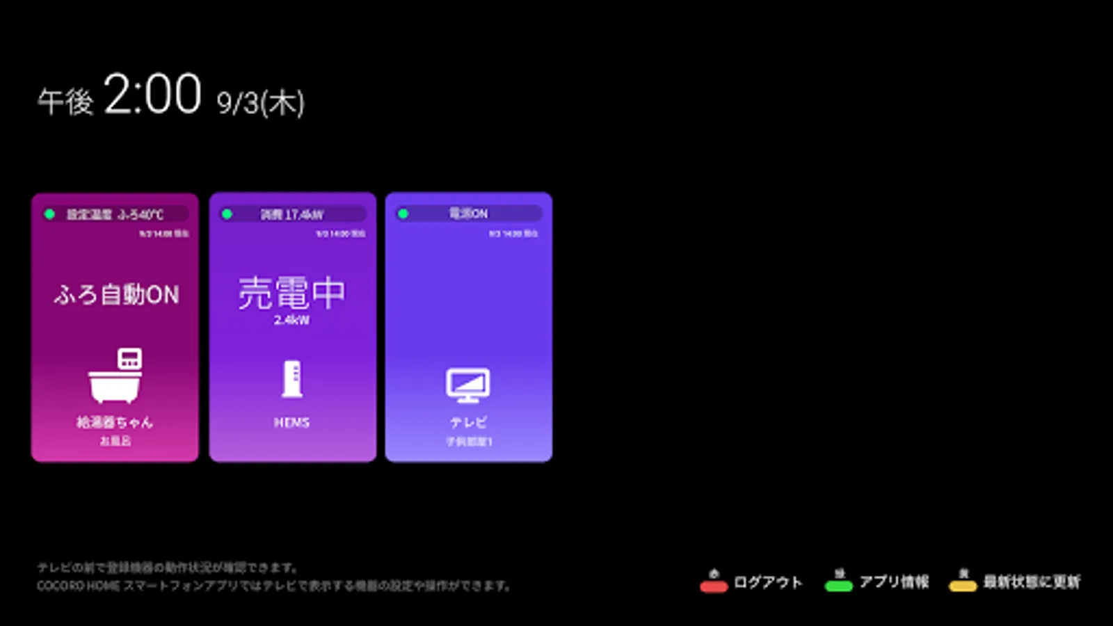 スマートフォンアプリ「COCORO HOME」に機器登録した製品の動作状況やお部屋の室温等がテレビの大画面で確認できます。