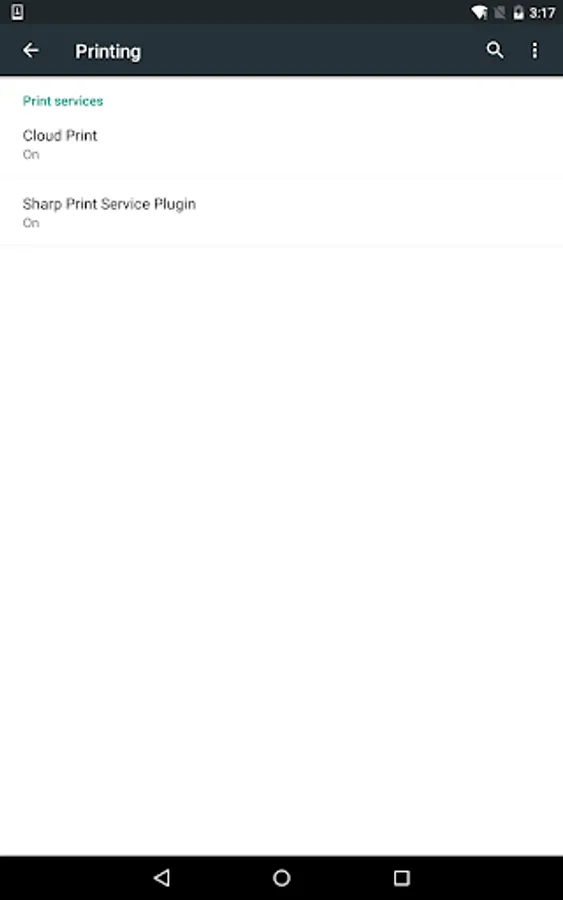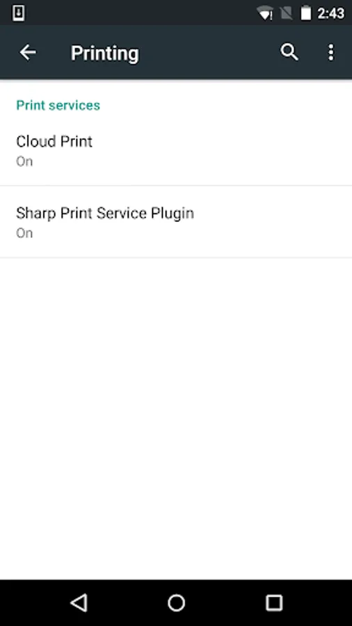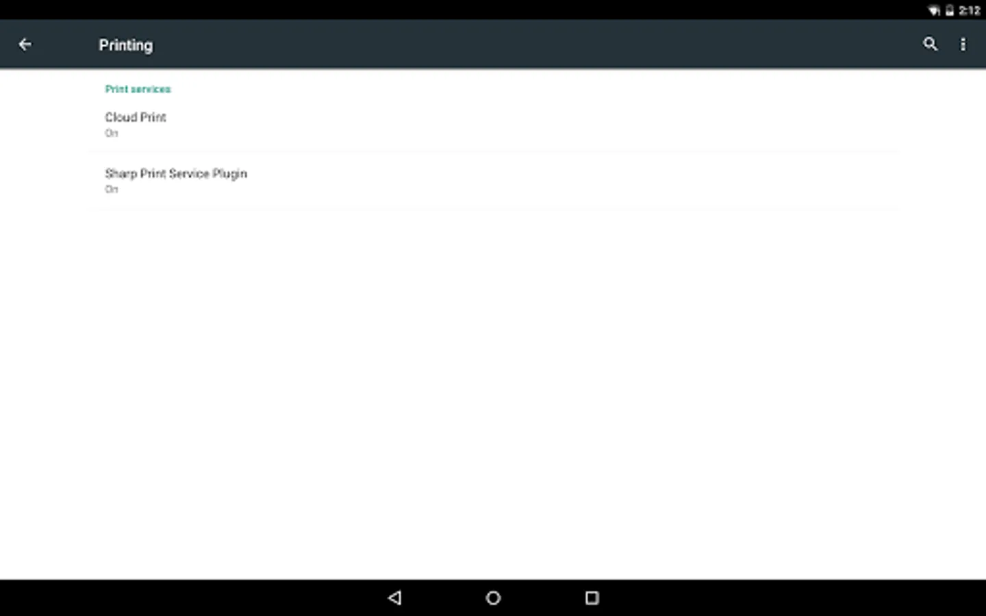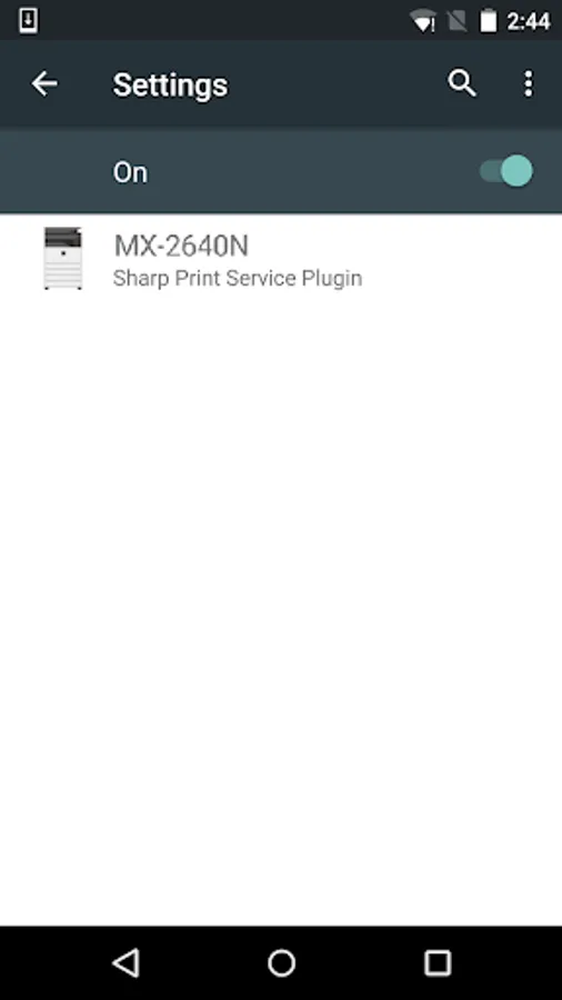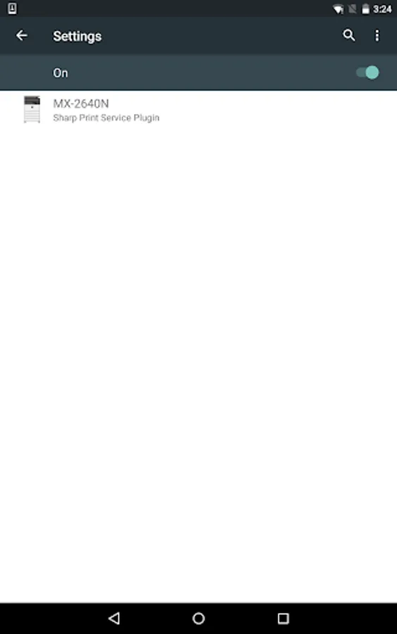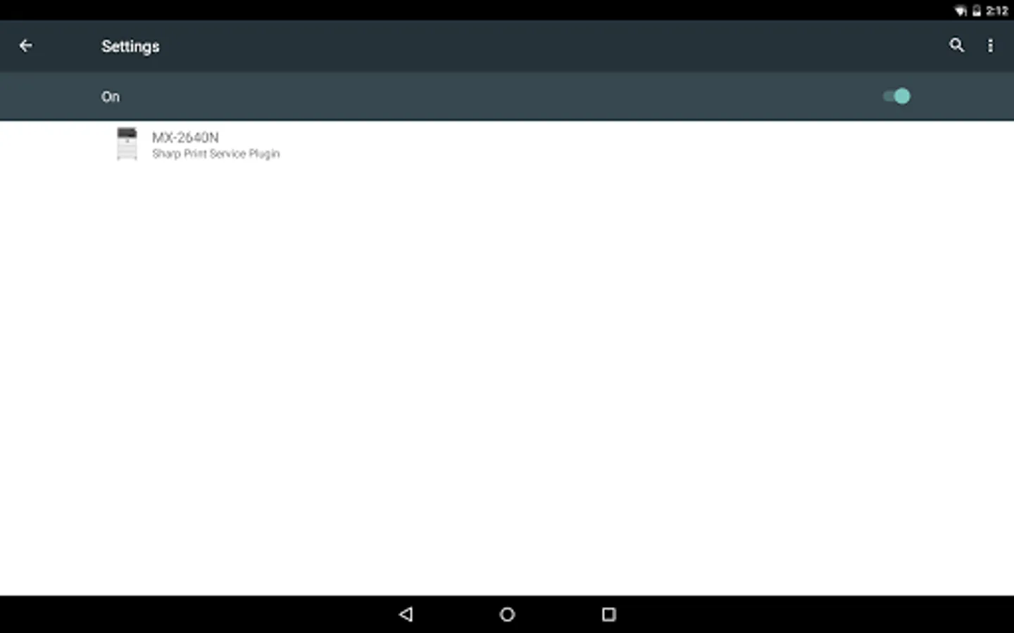 The Sharp Print Service Plugin enables printing of documents and images on an Android mobile device to a supported Sharp MFP. To activate this app, open the print option under the settings menu on your Android mobile device, select Sharp Print Service Plugin, and then turn the switch ON.