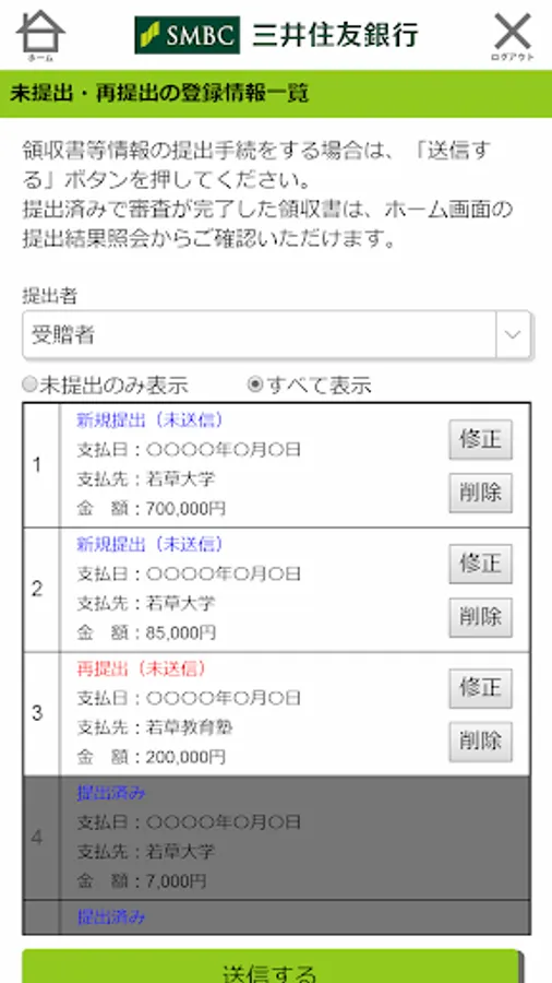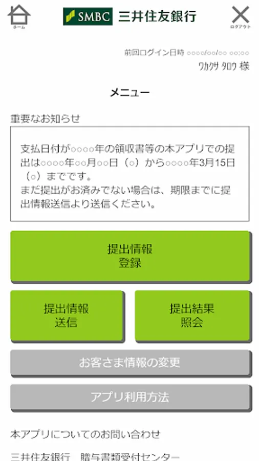 This is a receipt submission application for Sumitomo Mitsui Banking's ordinary deposit (tax exempt account for gifting educational funds). Simply log in with your customer ID and password provided by the Bank in advance, enter details such as receipts, take a picture of the receipt, and send it to complete the submission.