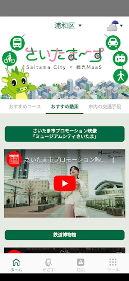 ・On "Home", you can check transportation information useful for sightseeing in Saitama City, recommended videos that will make you feel attractive, spot information that allows you to visit famous places, stamp rallies for limited-time events, and recommended courses of various genres.