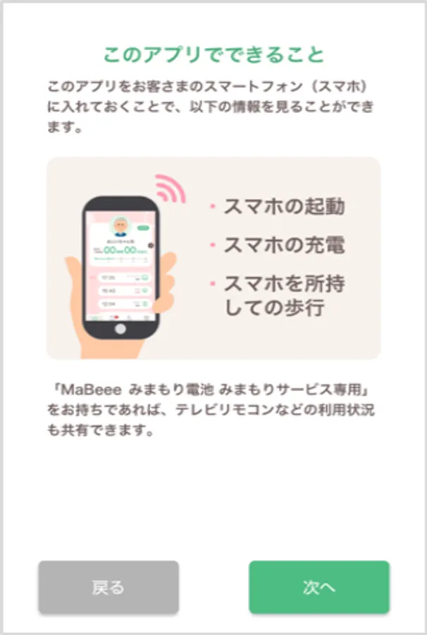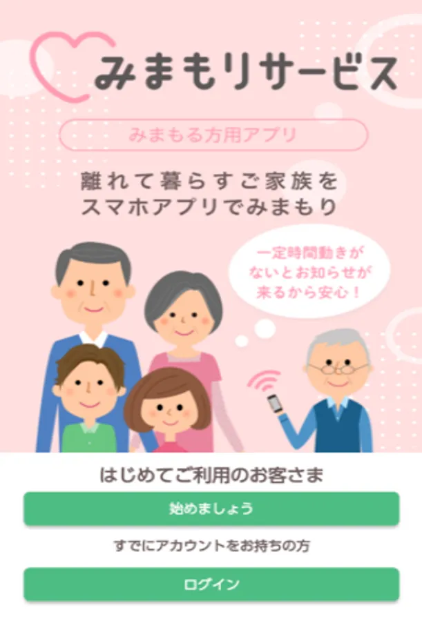 見守りたい方のスマホに別途「みまもりサービス (みまもられる)」アプリをダウンロードしていただくことでご利用可能です。
