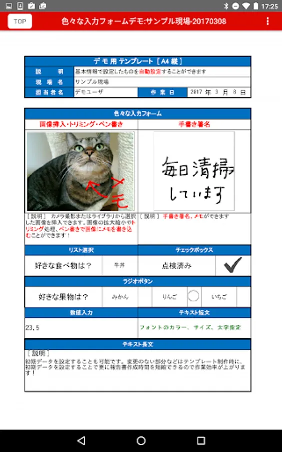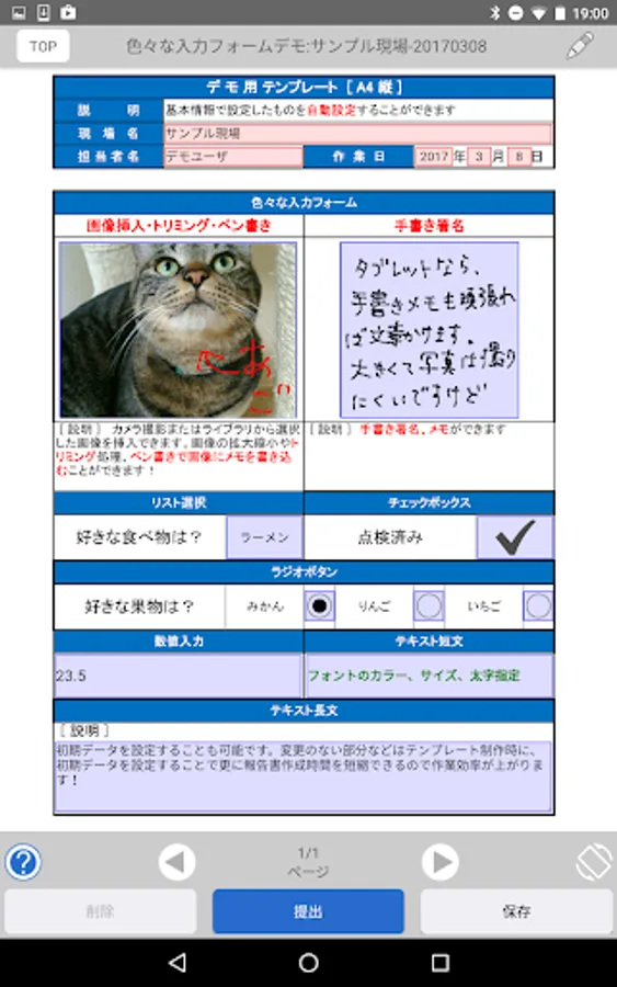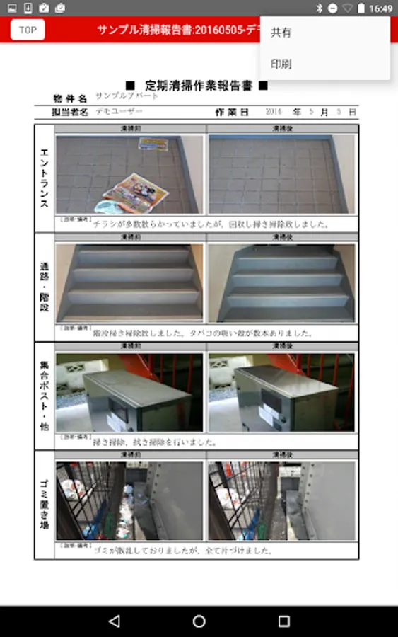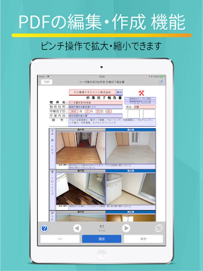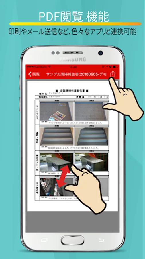 あとは、電波の良い場所で「提出」の操作をすると、サーバにデータが送信されPDFファイルの報告書が作成されます。作成したPDFファイルは、クラウドPrintで印刷も可能。また、メールなどその他アプリに共有することもできます。