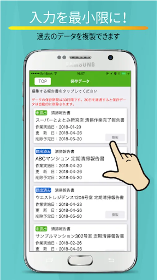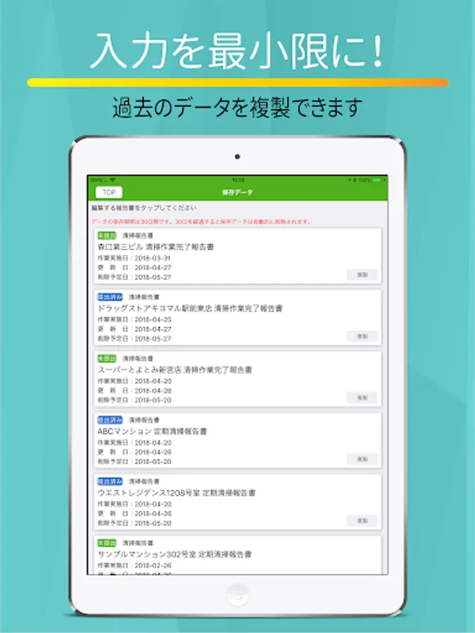 ・保存データは「複製」することができます。定期清掃や定期点検など、過去の報告書の保存データを複製することができるので、何度も同じことを入力する手間がなくなります。