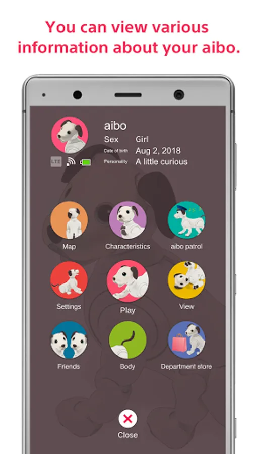 In addition to accessing system settings and owner information, other features include "aibo Photos," which lets users view any pictures taken, and a feature to "Play" with a virtual aibo inside the app.