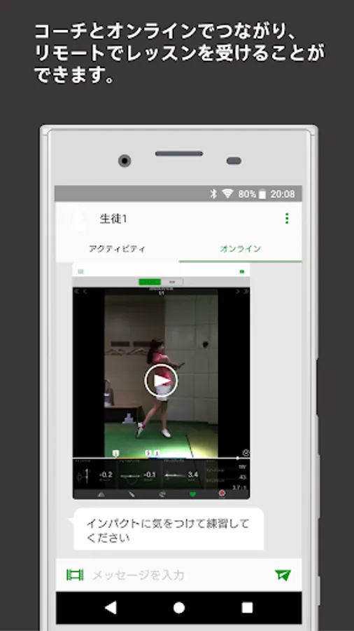Video and data can be sent to the coach remotely. You can get close support from your coach even during self-practice between lessons.