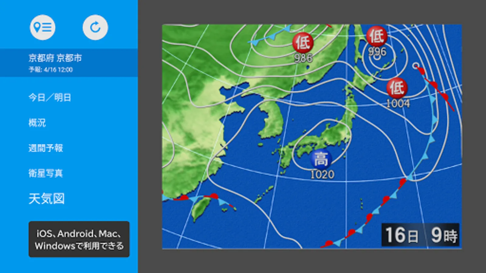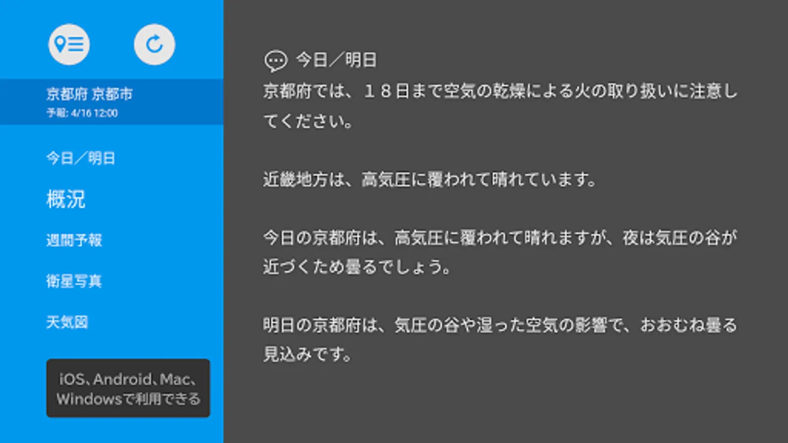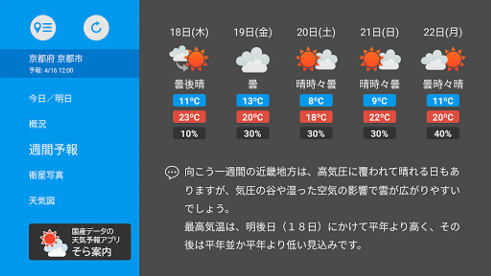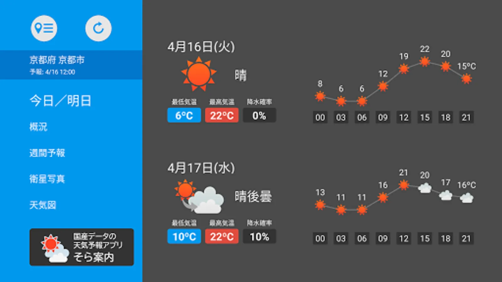 Sora Guide is an application that displays weather forecasts for various parts of Japan based on information provided by the Japan Meteorological Association.