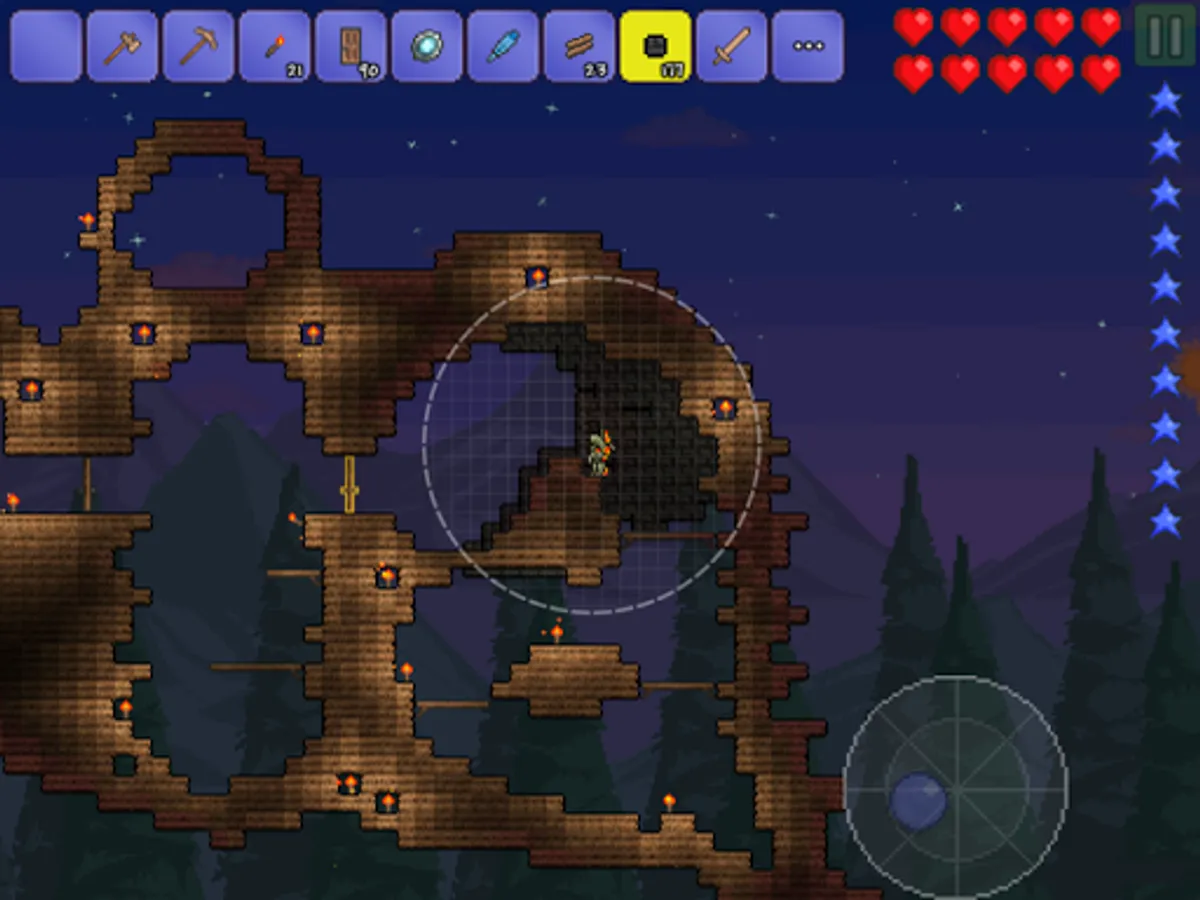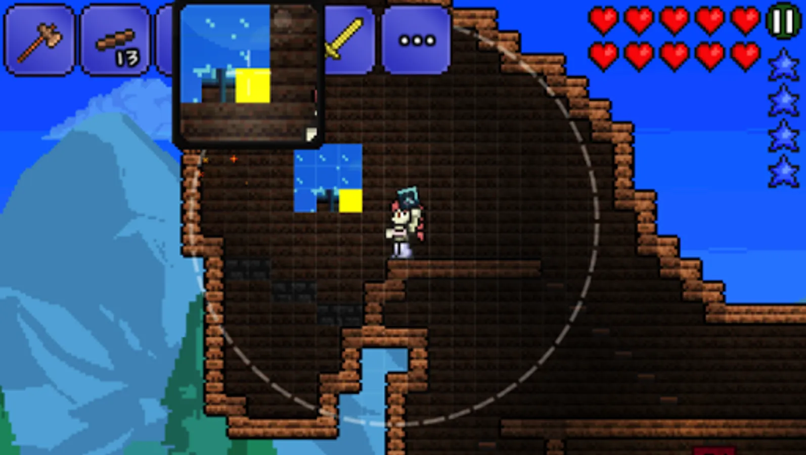 The world of Terraria is made up of blocks of wood, soil, ore, and can be collected as materials by cutting it with a pickaxe or axe.