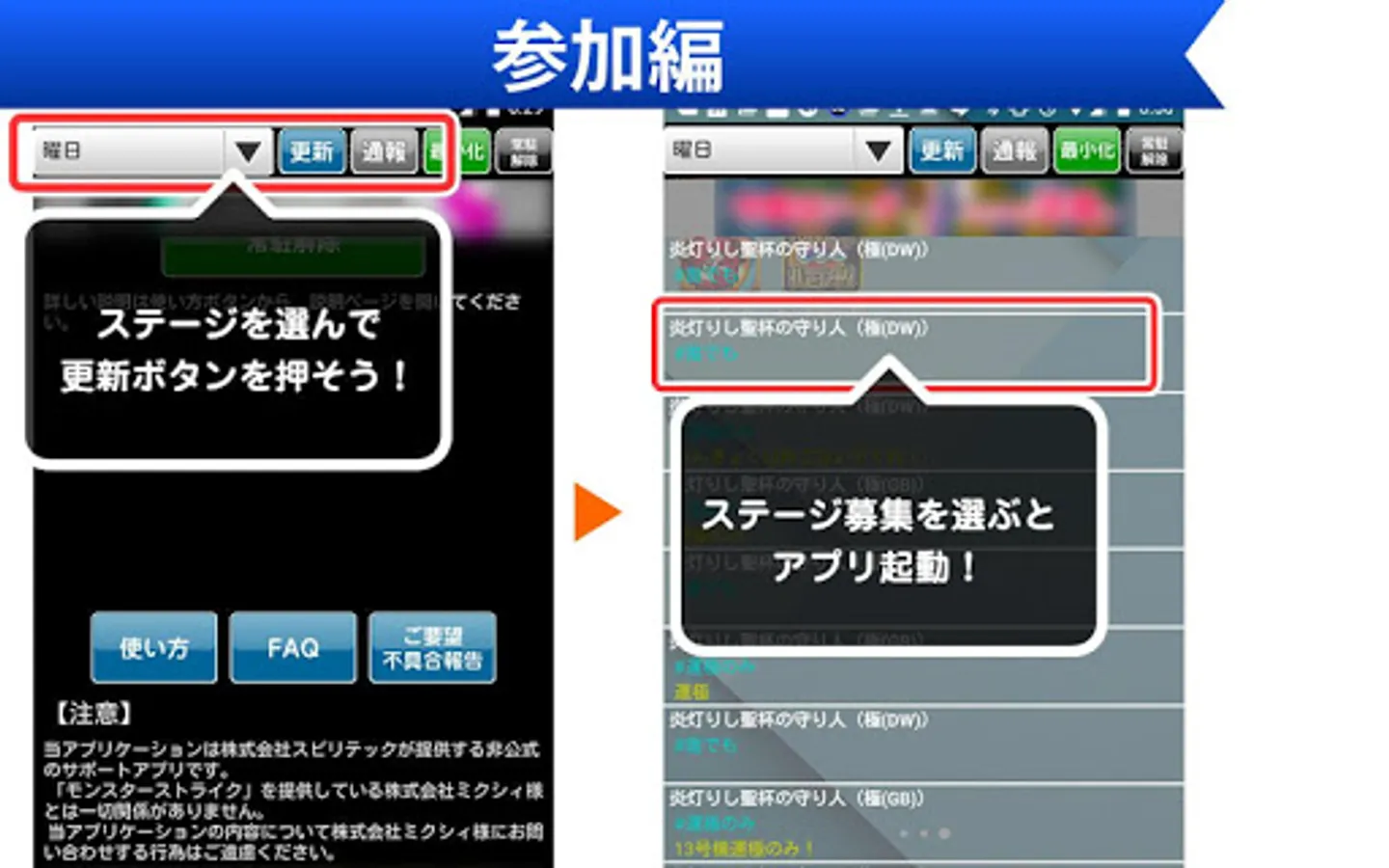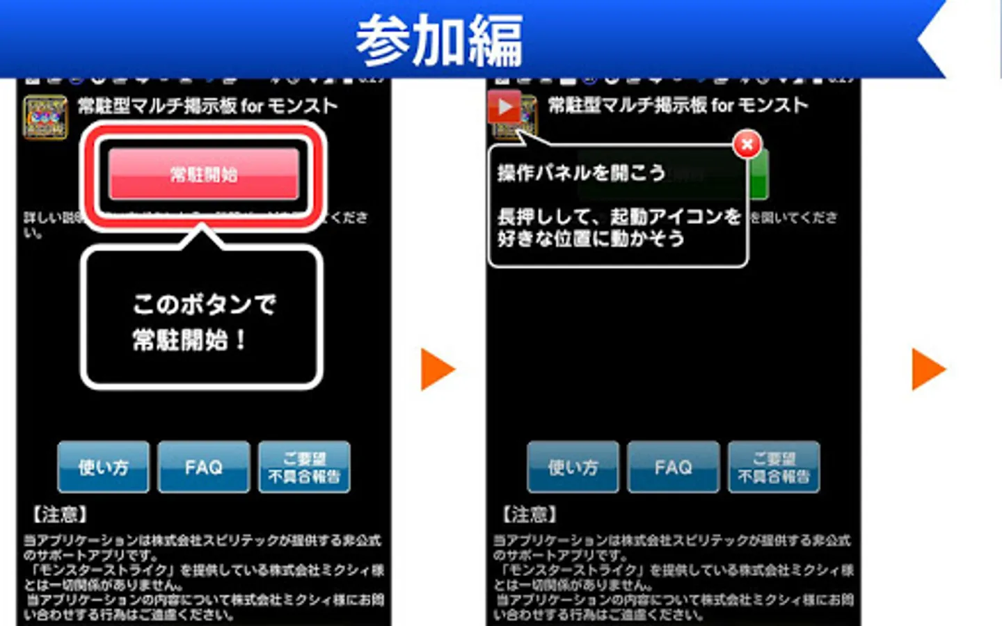 It is an unofficial support application that performs multi-matching, where you can call for recruitment / participation directly from the monster game screen. This app has nothing to do with Mixi.