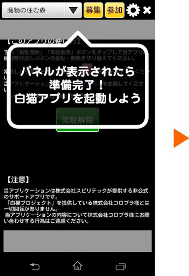 白猫プロジェクトのゲーム画面から直接募集/参加の呼びかけができる、「白猫プロジェクト」の協力バトルのマッチングを行う非公式のサポートアプリです。このアプリはコロプラ社とは一切関連はありません。