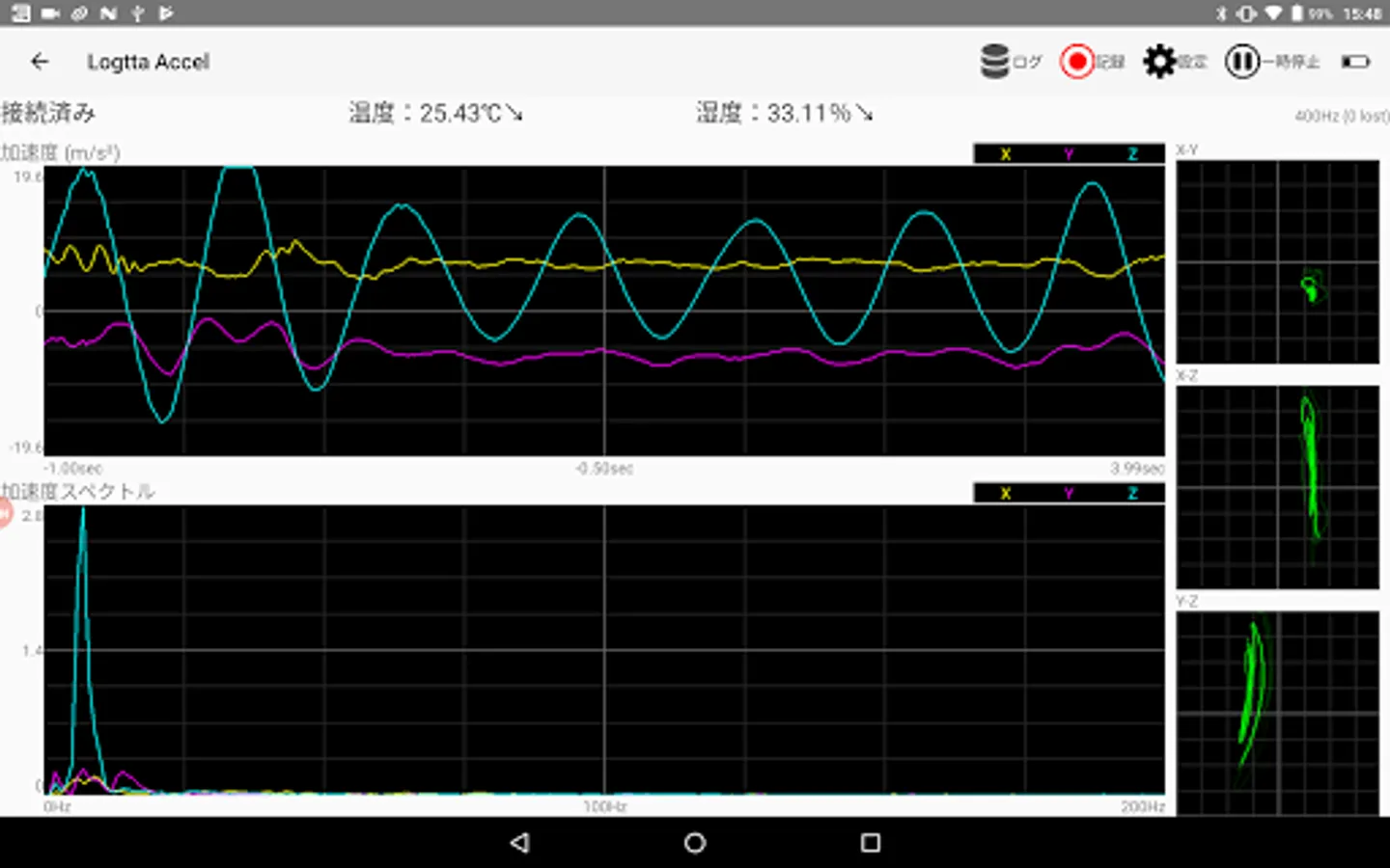 ・ In addition to the function to zoom in / out by pinch operation, scroll by swipe, and playback of acceleration data recorded in CSV file, you can also observe acceleration spectrum by FFT and Lissajous figure of 3 planes at the same time.
