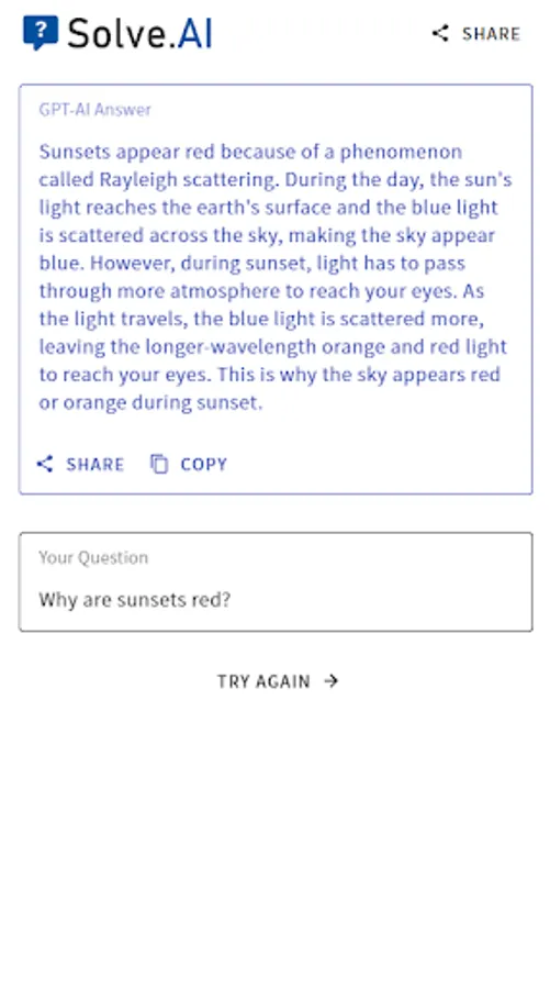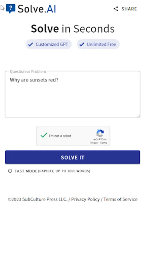 Our app is designed to be fast, reliable, and easy to use. Simply type in your question and let ChatGPT do the rest. You'll receive a clear and concise answer in seconds, without any fluff or unnecessary information. Plus, with unlimited queries, no login required, and no hidden fees, SolveAI is the most convenient and affordable solution out there.