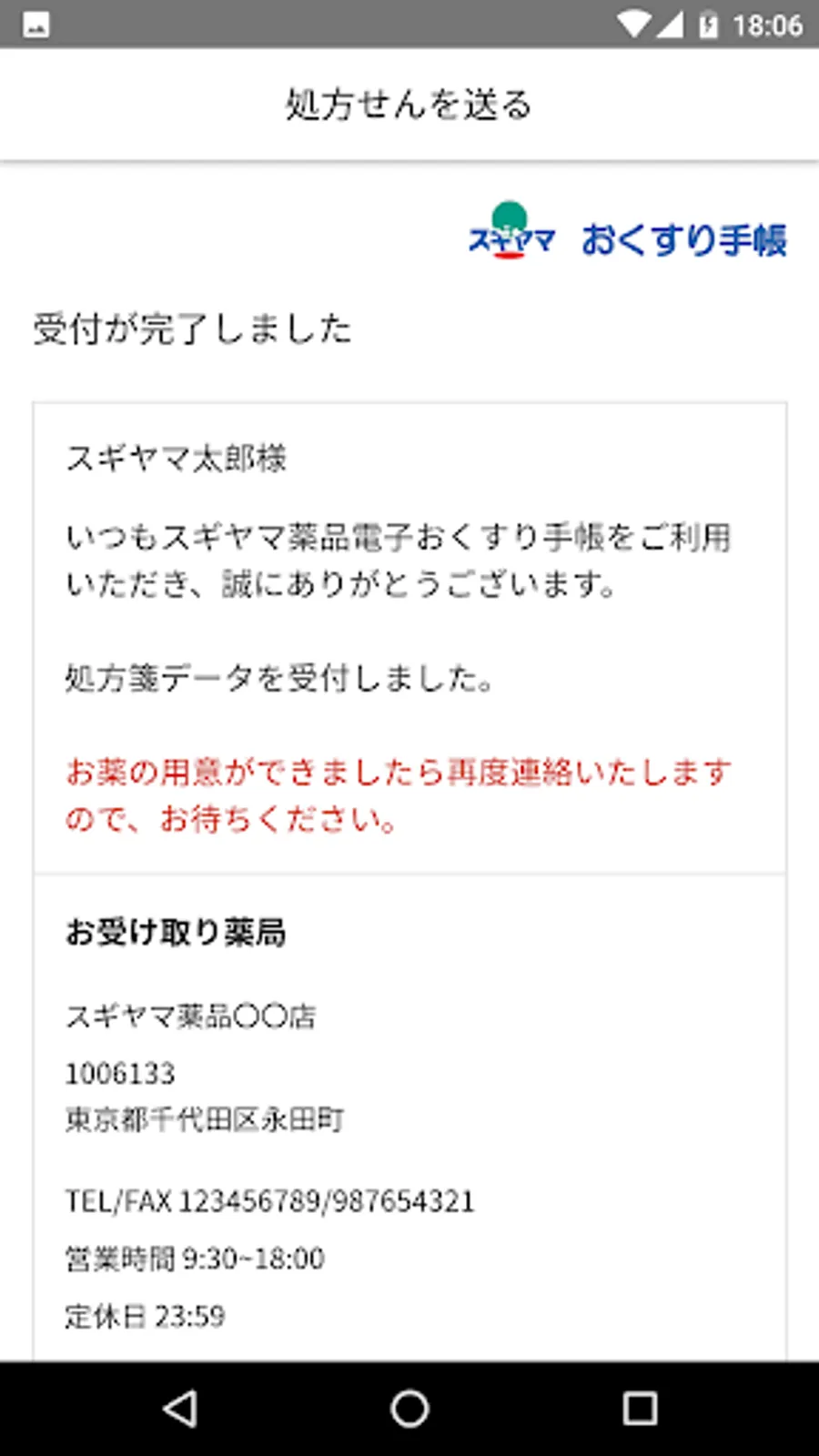 また、処方箋の画像データをスギヤマ薬品グループの「スギヤマ薬品 電子お薬手帳」システム実施店舗に送信することで、事前にお薬の準備を依頼することができます。便利な機能満載の「スギヤマ薬品 電子おくすり手帳」をぜひご利用ください。