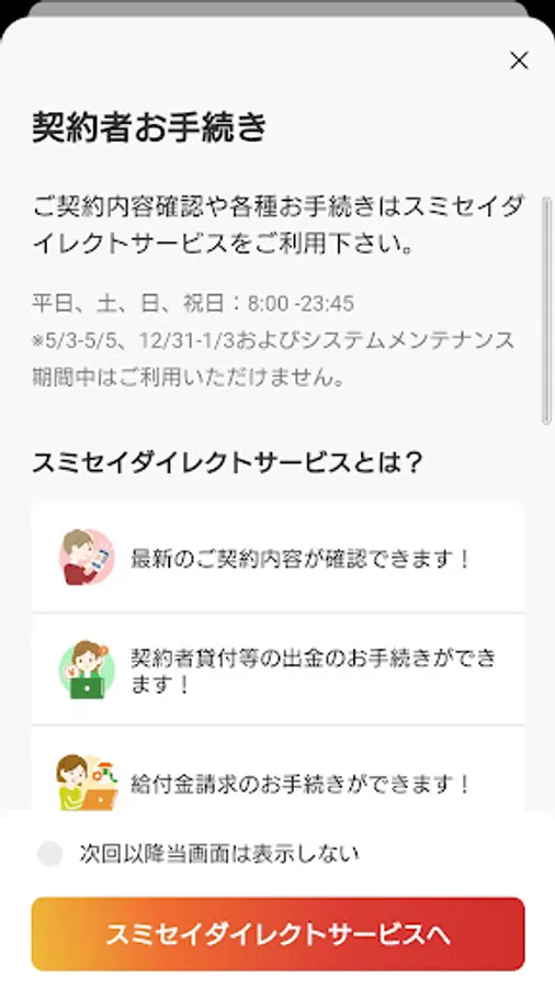 Easy login with biometric authentication. It can be used not only by those who are enrolled in Sumitomo Life Insurance, but also by those who do not have a contract yet.