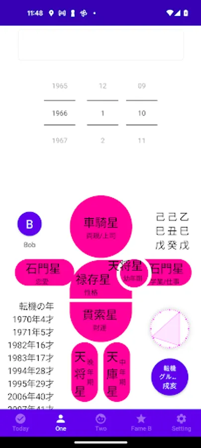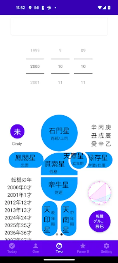 The single-person fortune is a simple design where you only need to adjust the dial to match the person's birthday whose fortune you want to check. Then, just tap on the desired area of the fortune. The right-side fortune dice are determined from the date of birth, and your fortune is instantly evaluated based on that value. For subscribers, the iShowWATCH triangle will move every time you change the birthday.