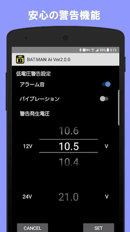 電圧低下アラーム:設定電圧を下回った時にアラーム音とバイブレーション警告。