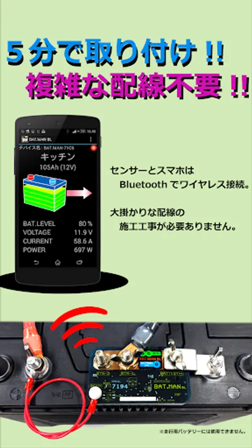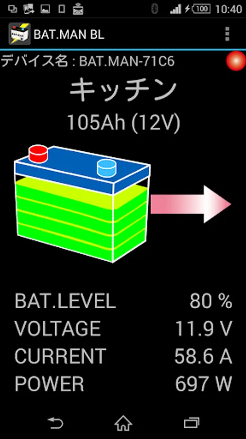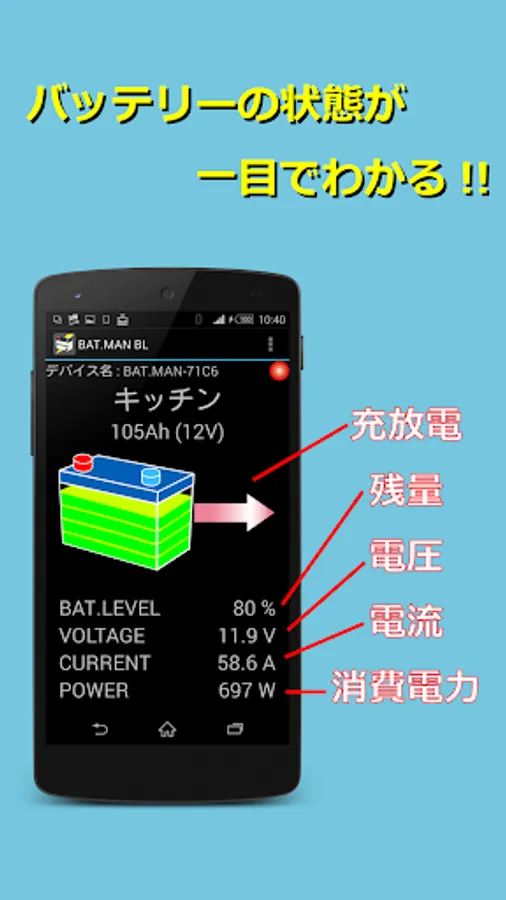電圧、電流、電力、残量をスマートフォンで簡単チェック。