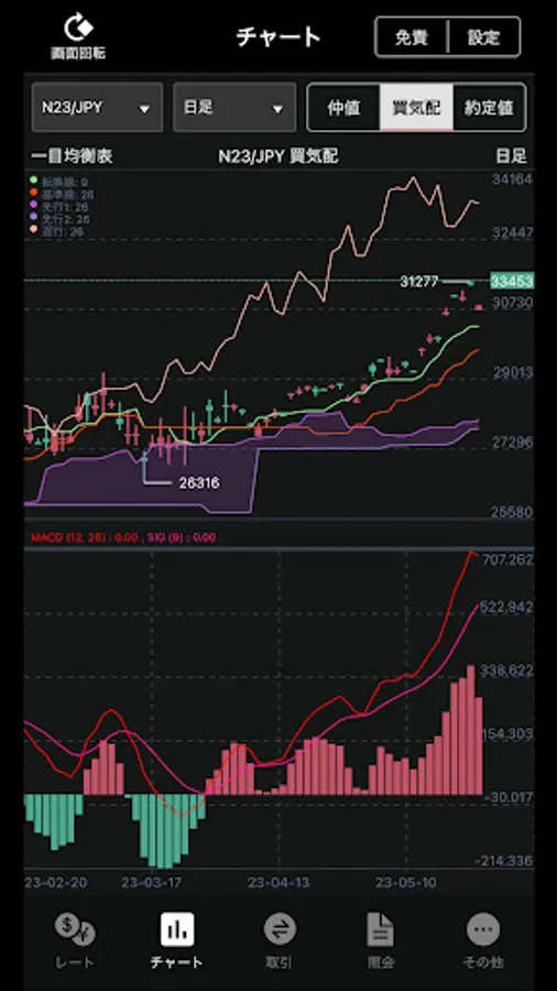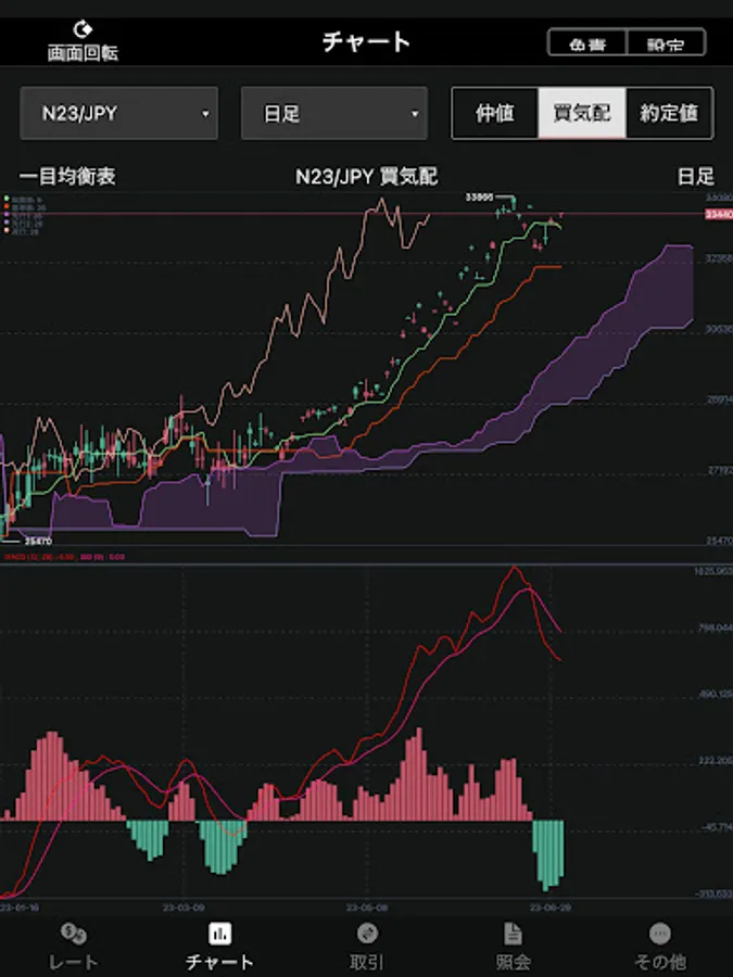 2. Chart display (simple moving average, Ichimoku Kinko Hyo, Bollinger Bands, Stochastics, RSI, MACD, etc.)