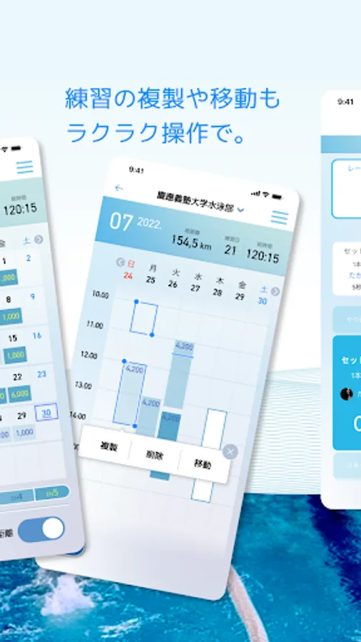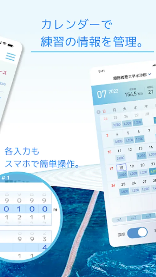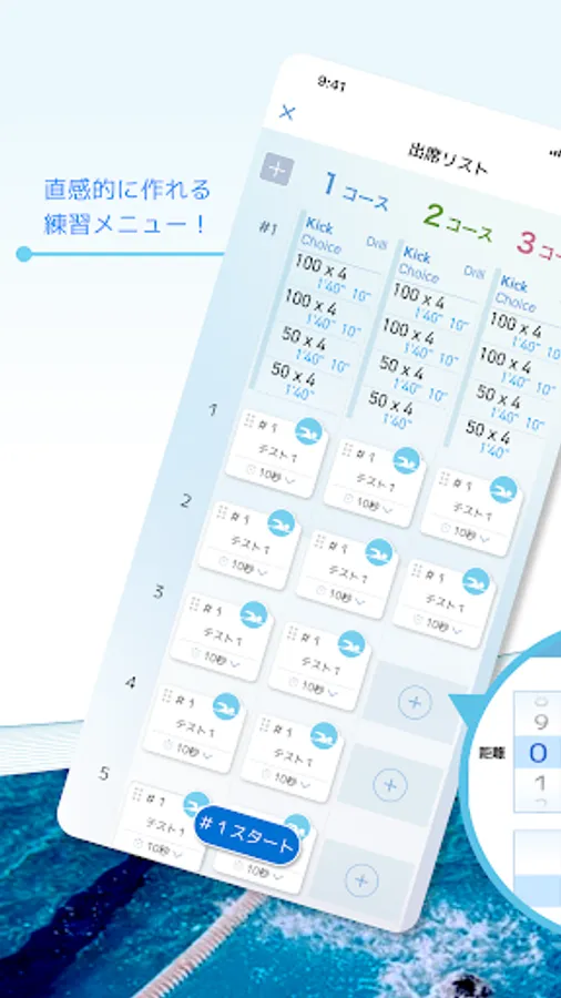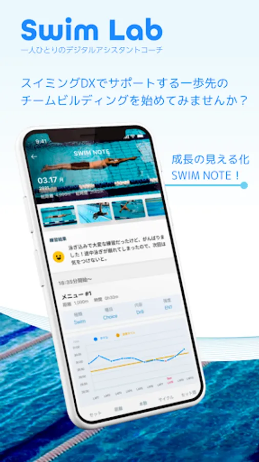 You can easily create a practice note "Swim Note" that summarizes the time and reflection points measured by the coach with the practice content & app.