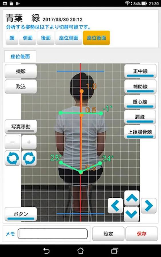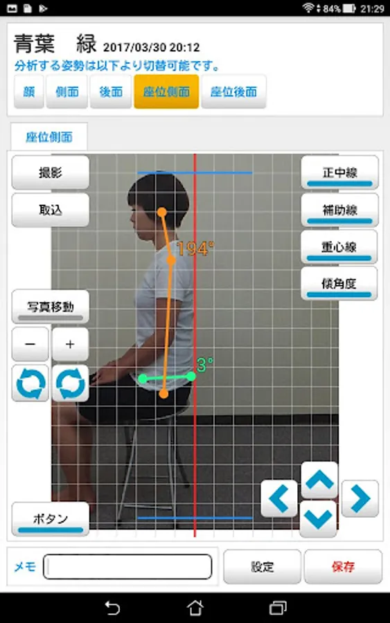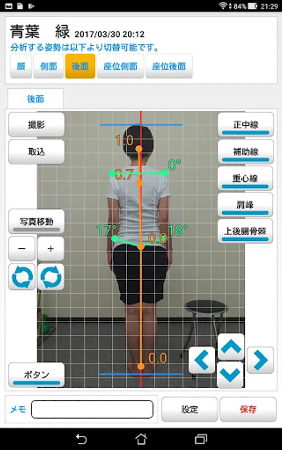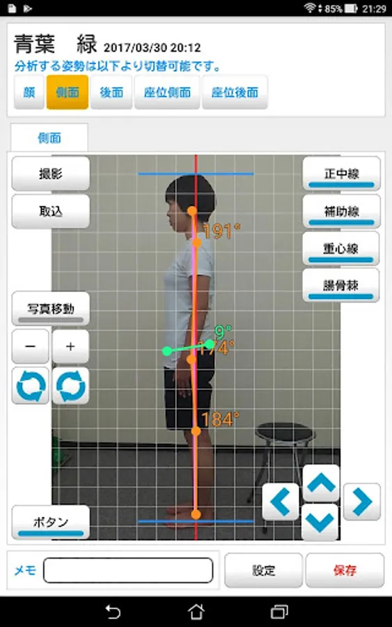 姿勢は立位の前面、側面、後面、座位の側面、後面の計5方向から測定できます。