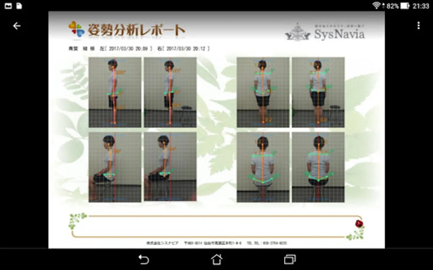 前面は目線、肩、骨盤、下肢を測定し、全体的な歪みを見ます。