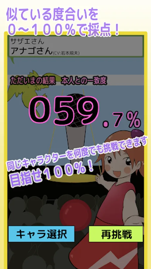 Using voice recognition AI, you can rate how much the voice of an anime character and your voice are similar, from 0 to 100%.