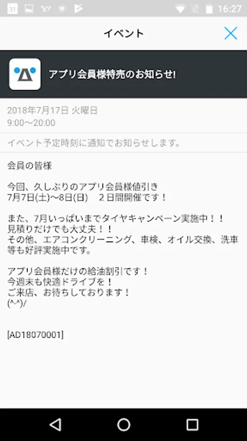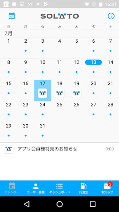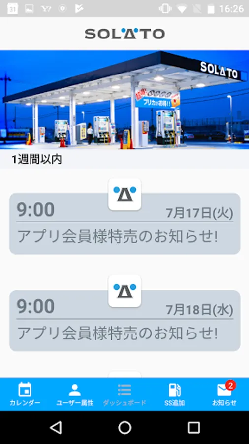 ▼登録した太陽石油の店舗から、お知らせが届きます。興味がある通知のみをカレンダーに登録して便利に活用ください。勿論、個人情報は完全に保護されております。