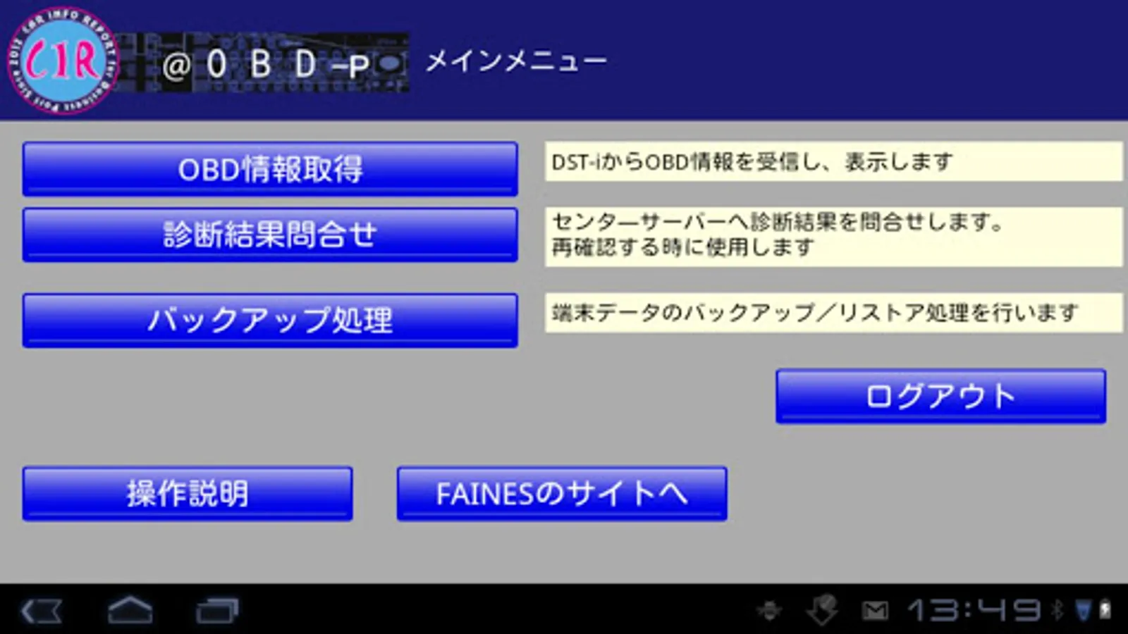 ※本アプリはandroid Pad端末(7インチ以上)専用のアプリです。androidスマートフォンでご利用の場合は、専用の「CIR@OBD-S」をご利用ください。