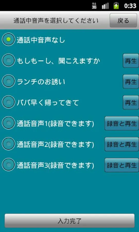 (3) Turn on the call button (call slider) from the incoming screen to display the call screen. On the call screen you can play the voice of the other party. Three types of audio are also available and can be selected. In addition to 3 types, you can also record your own voice and play it. (SD card is required for recording)