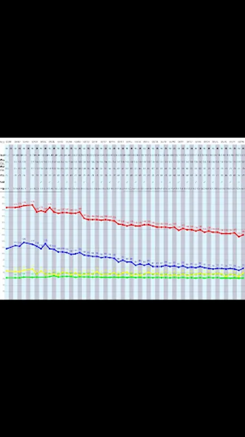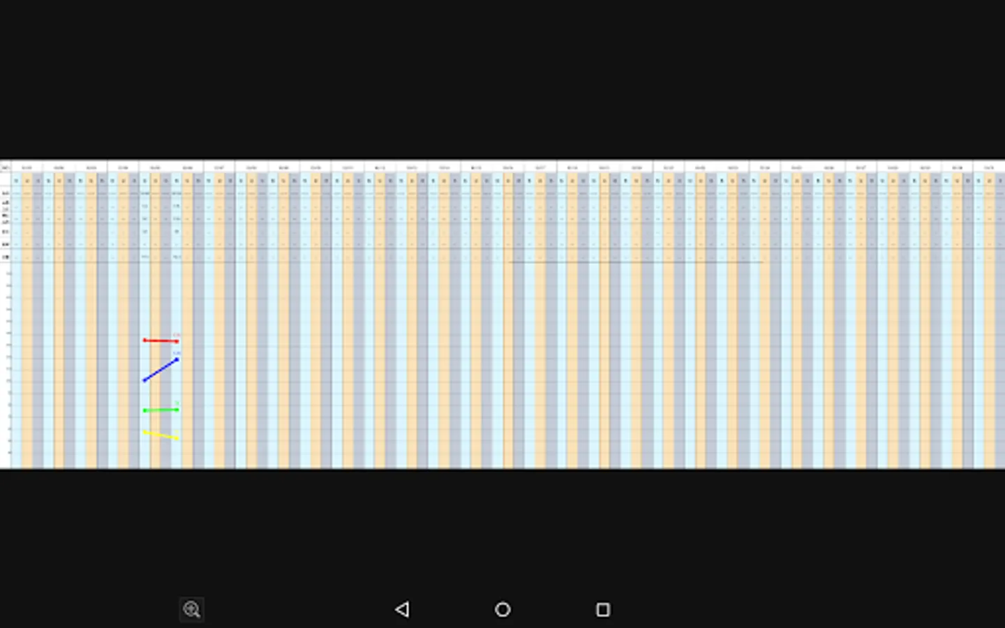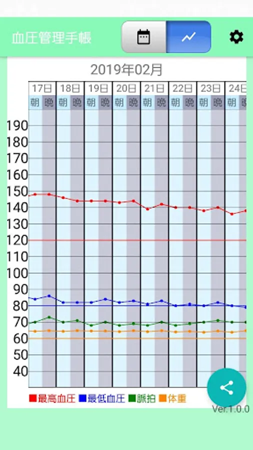 グラフでは目標値が最高血圧は赤線で、最低血圧は青線で表示されます