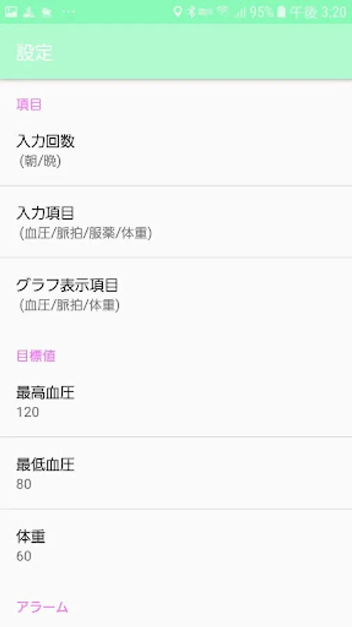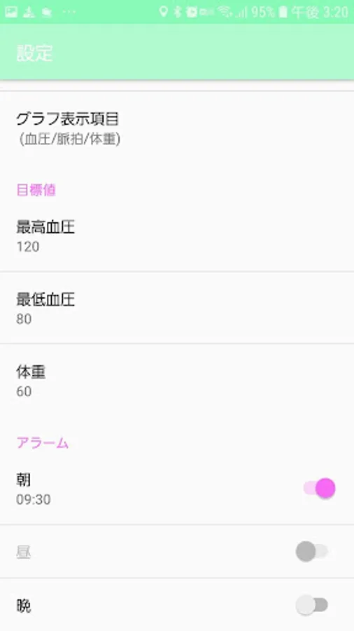 設定画面から、最高血圧、最低血圧の目標値を設定できます