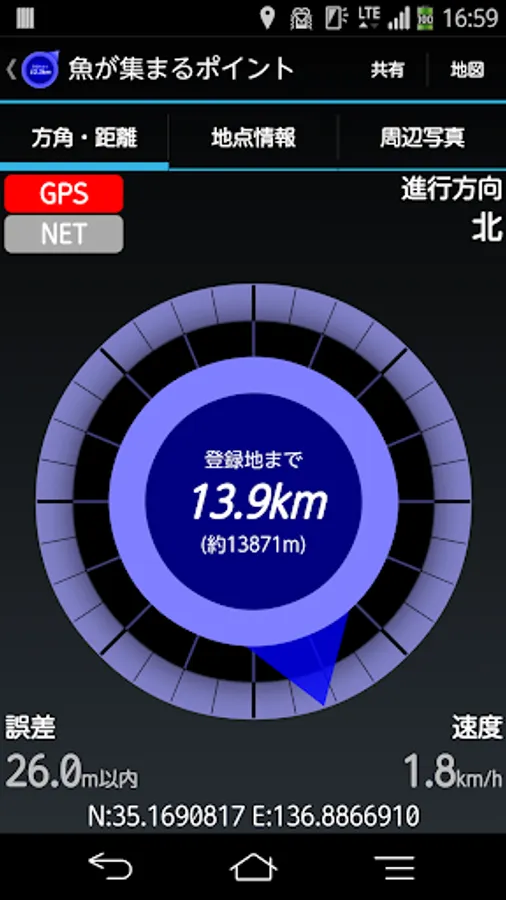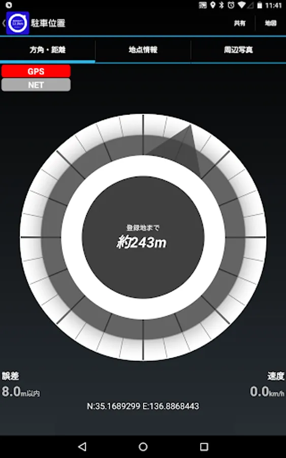 現在地を測位または地図から指定し、地点登録(位置情報登録)することができます。後で登録した地点までの距離と方角を表示することができます。