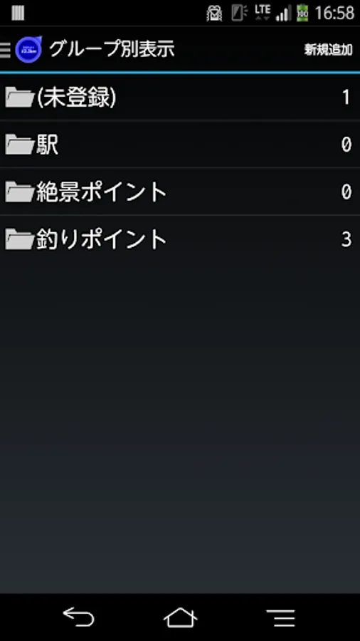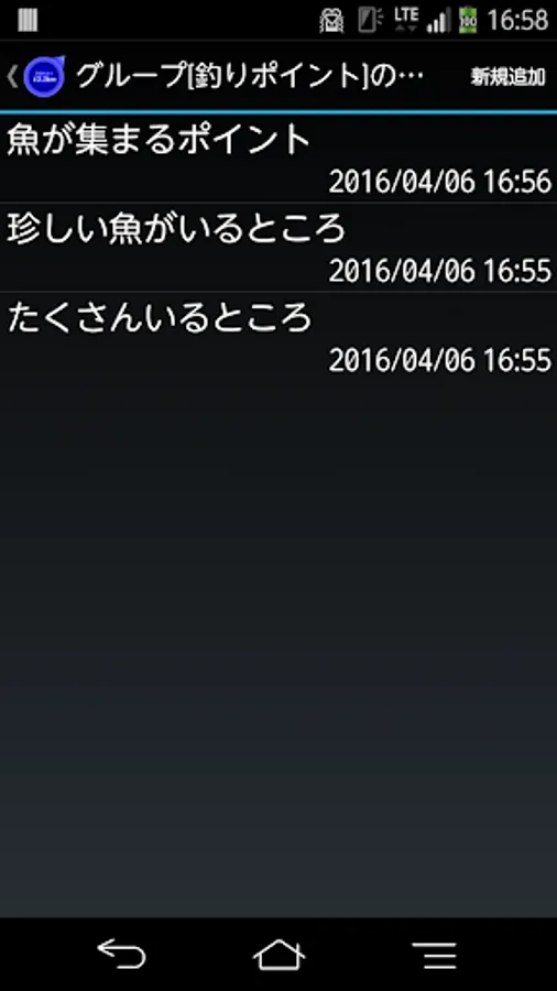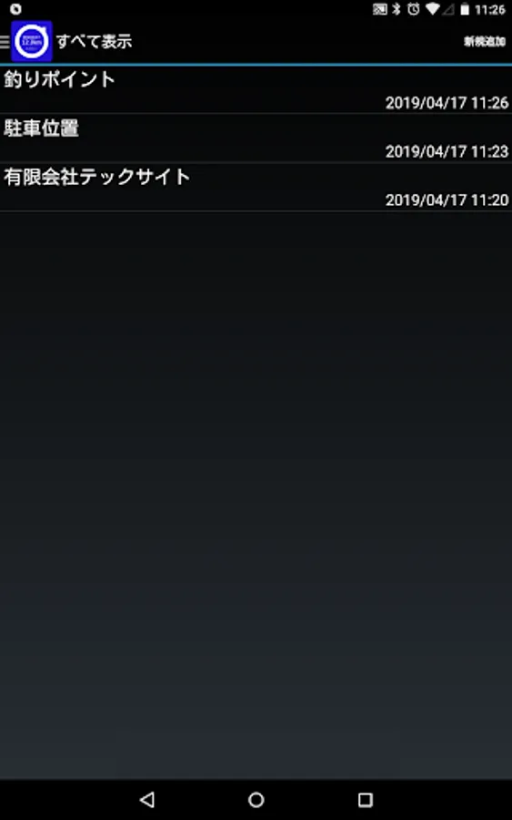 (2)地点の一覧が表示されている状態で、画面右上の「新規追加」ボタンをタッチします。すると、地点の登録画面が開きます。地点の登録画面が開くと位置情報の測位がはじまります。