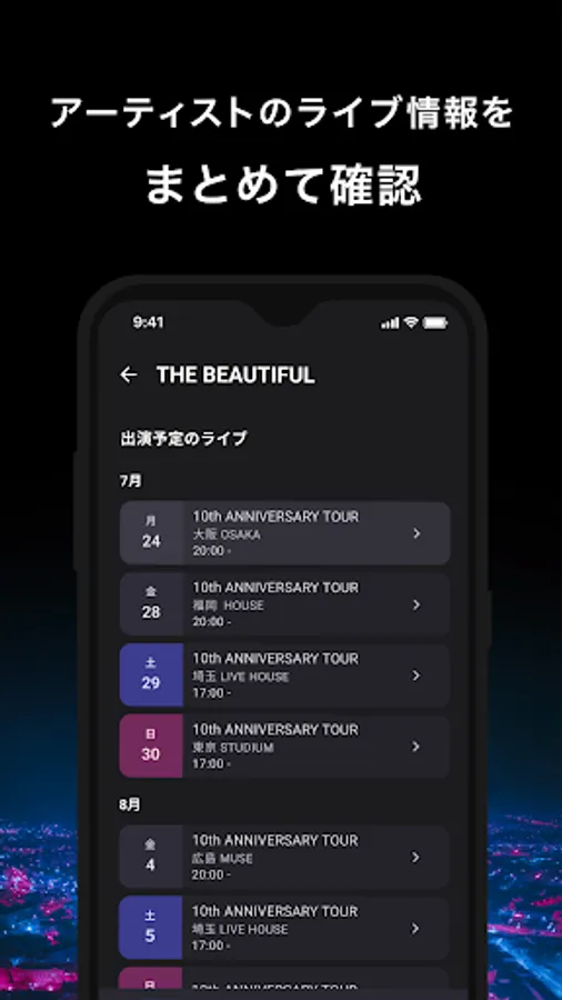 In cooperation with the music app you are using, we will deliver live information of your favorite artists.