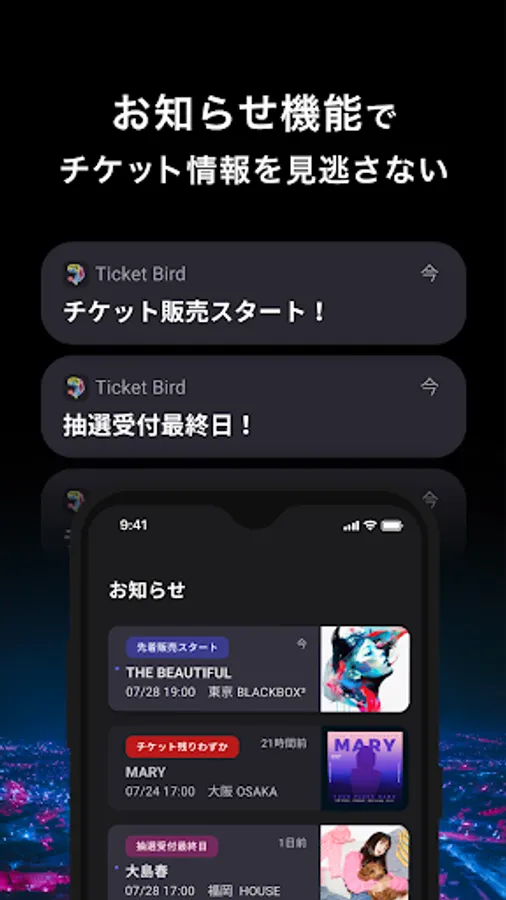 Ticket Bird is an app that helps you find live performances you want to go to and prevent missing tickets.