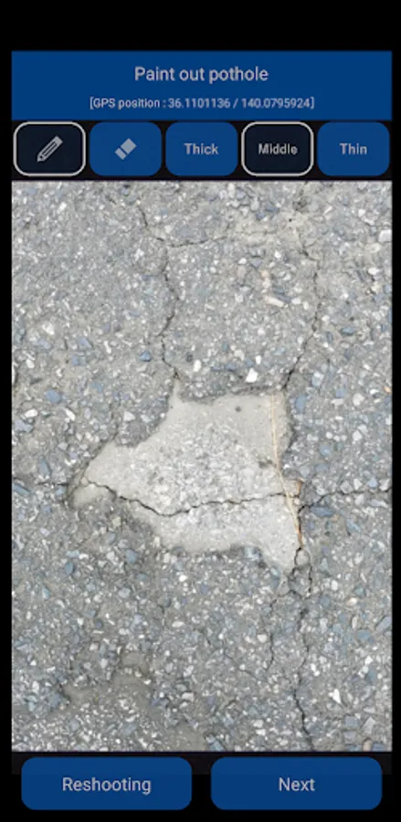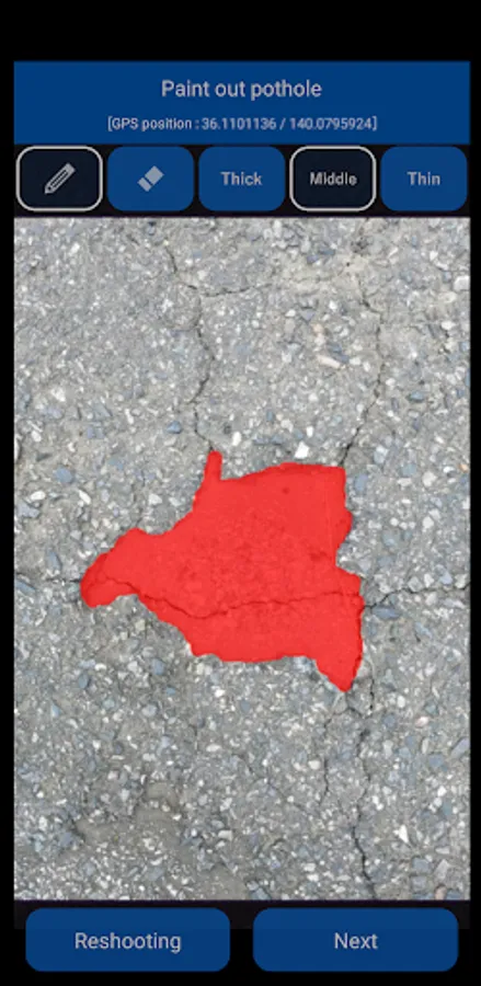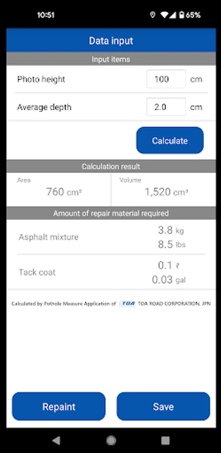 You can find the area and volume by taking a picture, filling the pothole area, and entering the approximate depth.