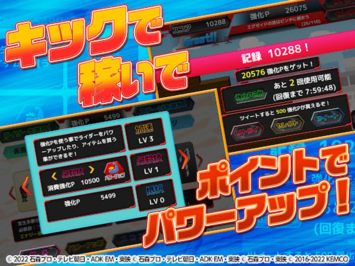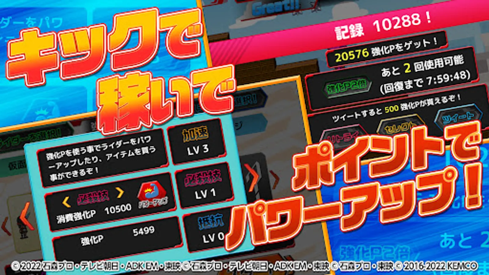 By consuming the strengthening points received at the end of the kick and customizing the Kamen Rider, it is possible to shoot a stronger kick.