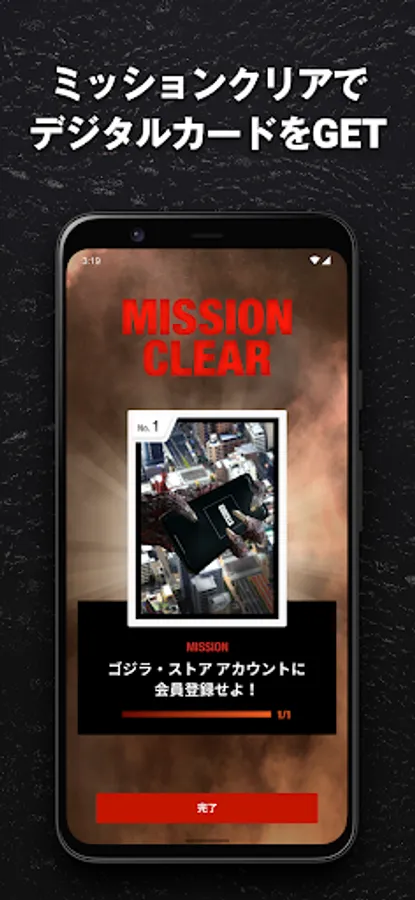 Clear various missions delivered by the app and win the original card "GODZILLA DIGITAL COLLECTION CARD" only for the app!