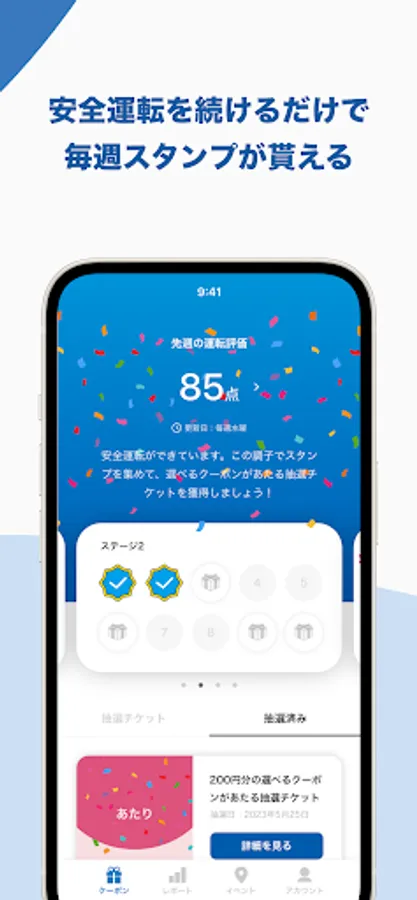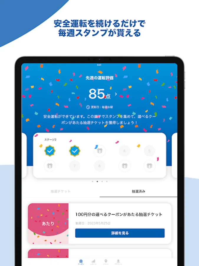 ・Stamps are obtained when the score of the safe driving diagnosis for one week and the mileage are above a certain level.
