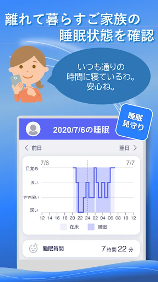 Life Rhythm Navi + HOME makes data from mat sensors and temperature / humidity sensors that measure sleep status easy to understand, and supports you to watch over the daily lives of elderly families.
