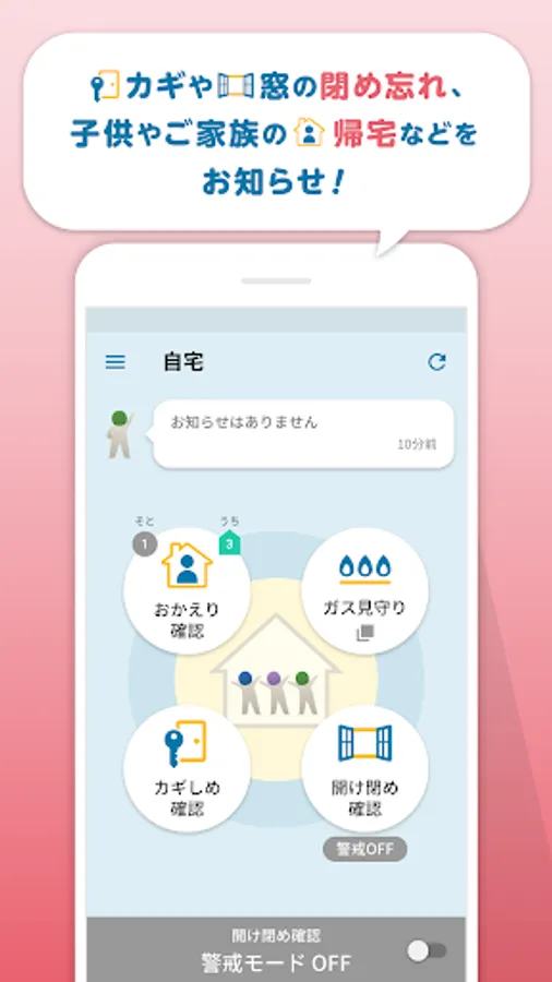 東京ガスくらし見守りサービスは、ガスの見守りをはじめ、家族の帰宅・外出、カギの閉め忘れ、留守中の窓やドアの開閉をお知らせし、外出先から確認することができるアプリケーションです。