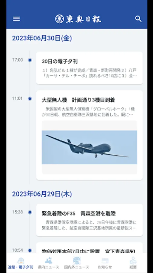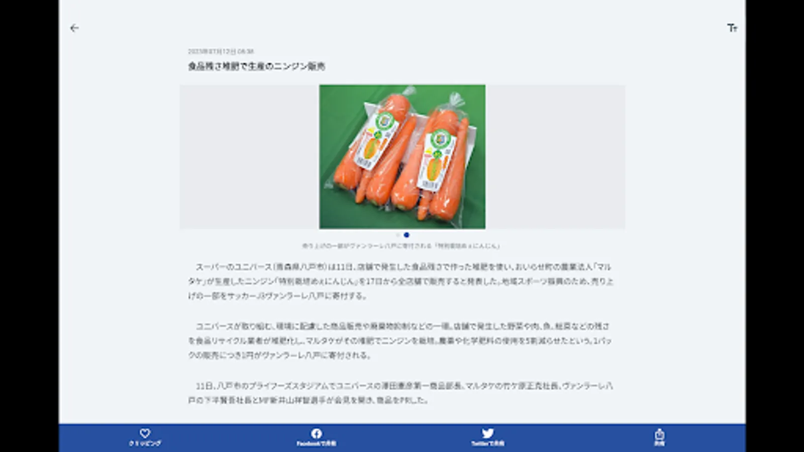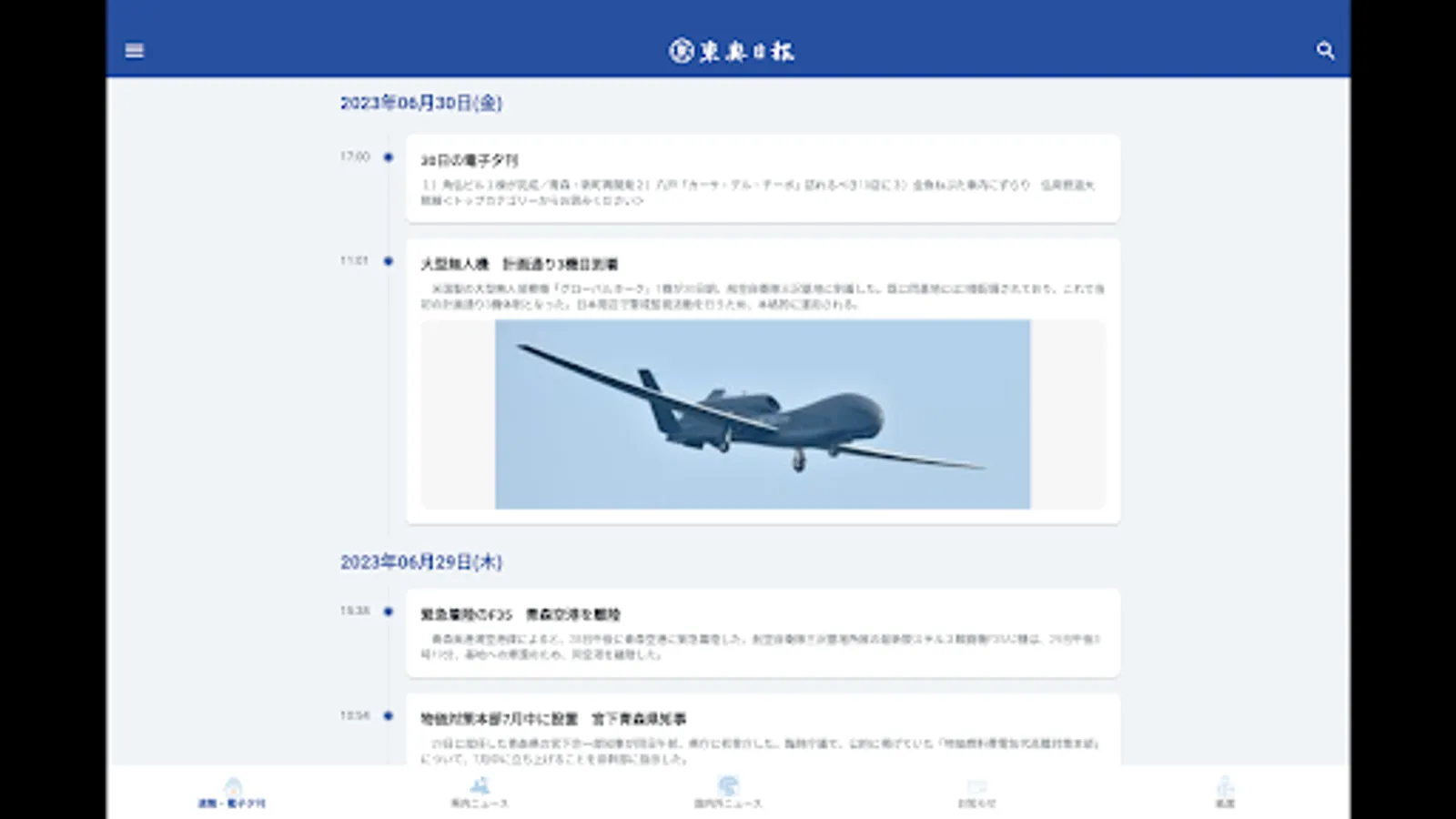 News in Aomori prefecture faster than anywhere else. The "Tooku Nippo App" pushes the breaking news, and in the evening, the "electronic evening edition" that picks up the news of the day is also pushed. You can access the news by tapping the notification banner and know what happened in Aomori prefecture. News is divided by genre, and headlines are displayed in chronological order. Swipe to move between genres. You can easily read the news with a simple operation.