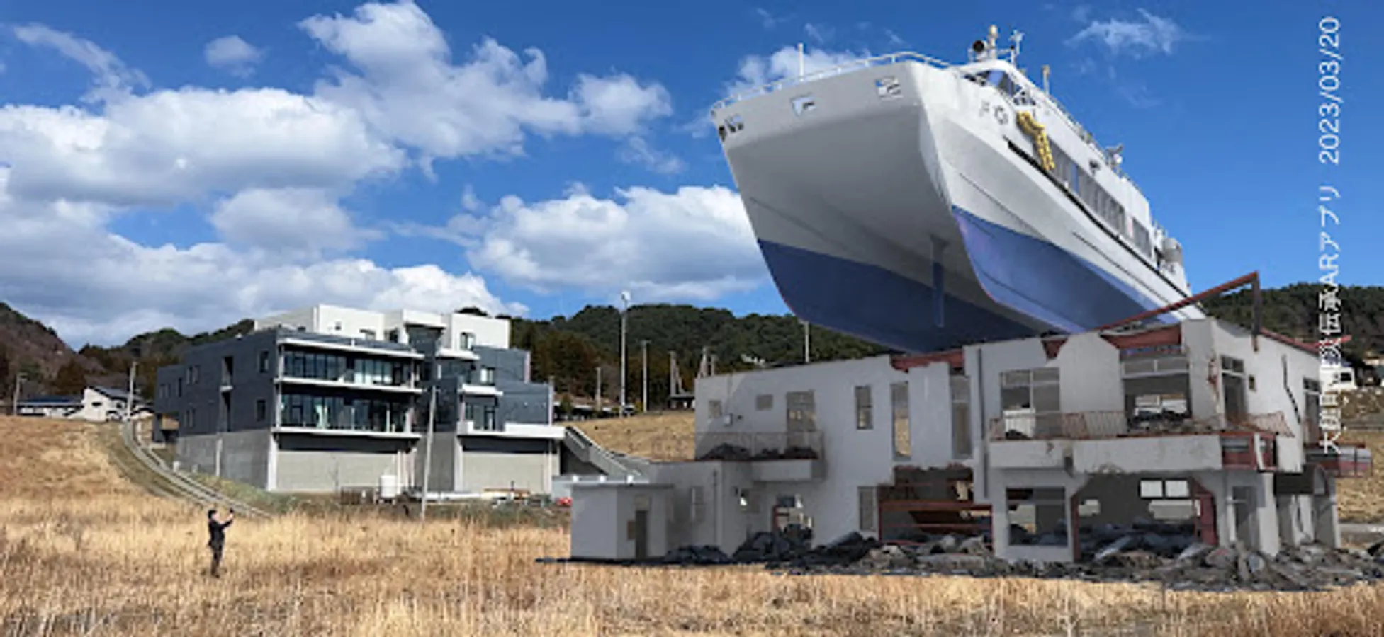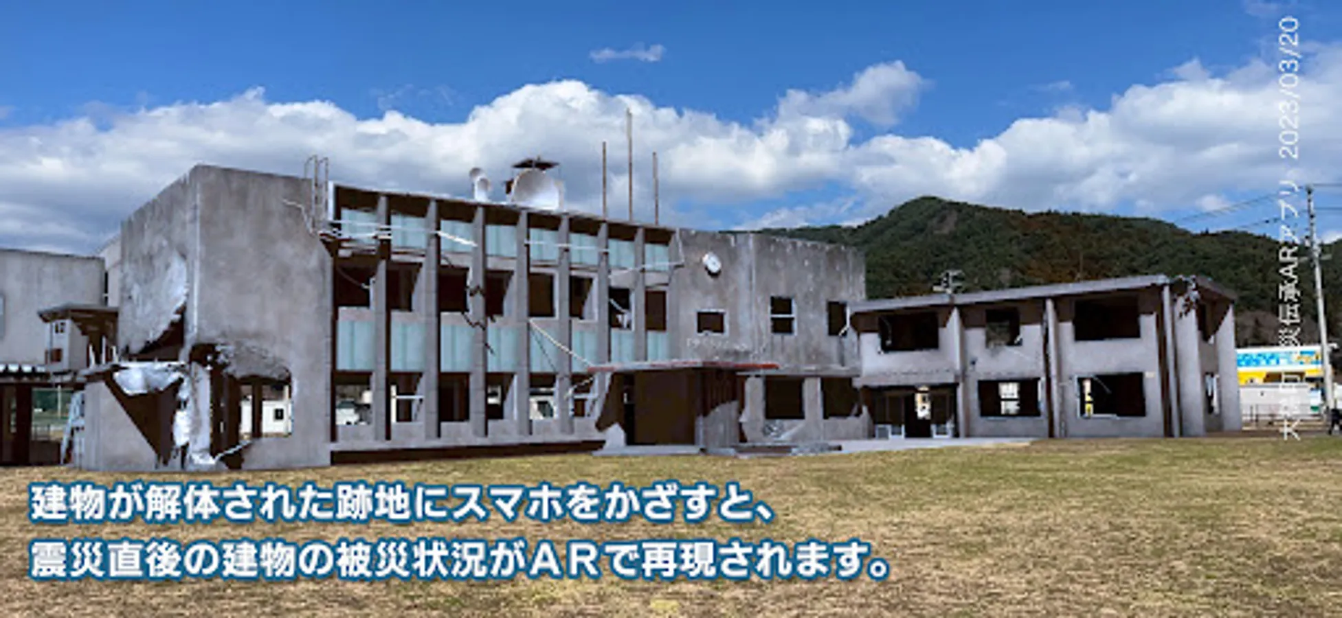 Two symbolic buildings, the "Otsuchi Town Hall Old Government Office" which was severely damaged by the Great East Japan Earthquake and Tsunami, and the "Old Minshuku Akabu" where Mayuri ran ashore, are located on the site where the buildings were dismantled. It is an application that you can see in AR (Augmented Reality) as it was immediately after the earthquake.