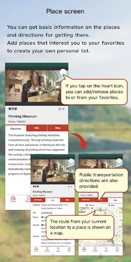 - After choosing Maps from tourist spot information, all you then need to do is choose how you’ll get there. TABIDO guides you to your destination via the ideal route!