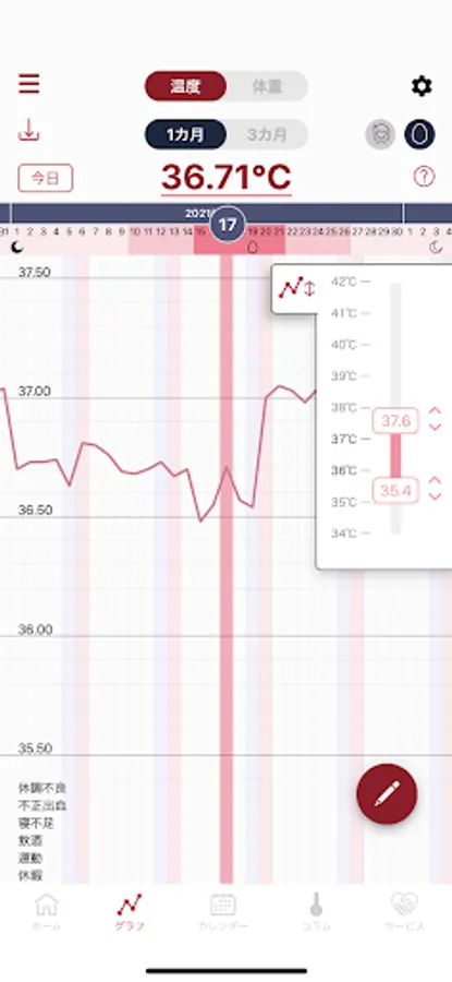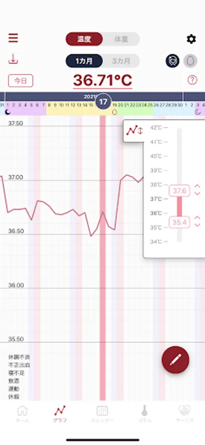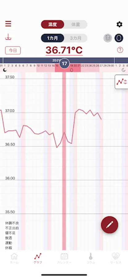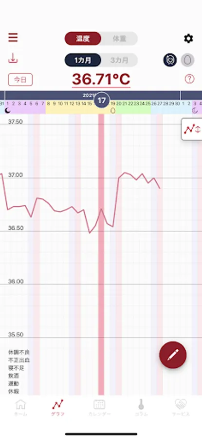 ・Graphs (temperature graph, color-coded prediction of physical condition, major event display, weight graph)