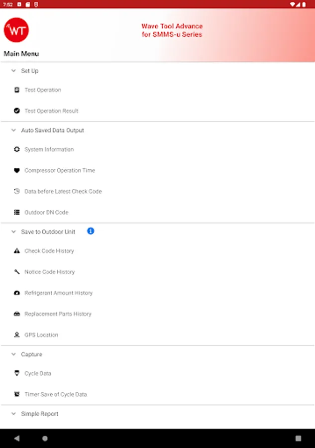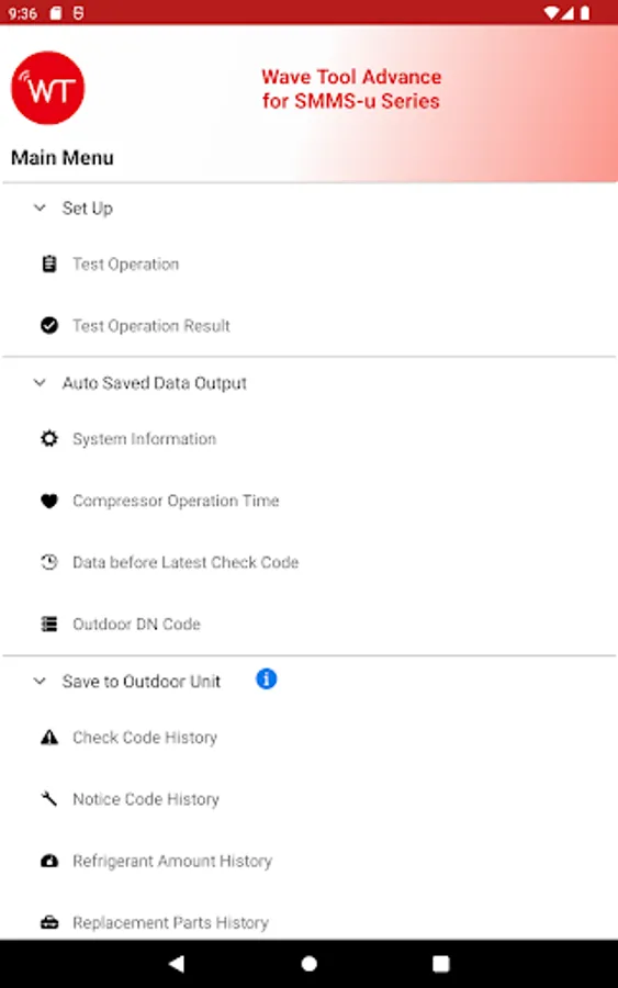 This application assists service of installation/maintenance for air conditioning equipment of TOSHIBA SMMS-u series or later and Carrier XCT Top Discharge series equipped NFC tag by getting and displaying data via NFC tag.
